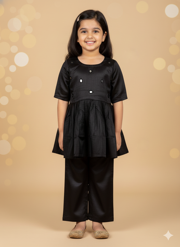 Klingaru Girl Kurta and Pants Set - Mashru Black with Mirror Work