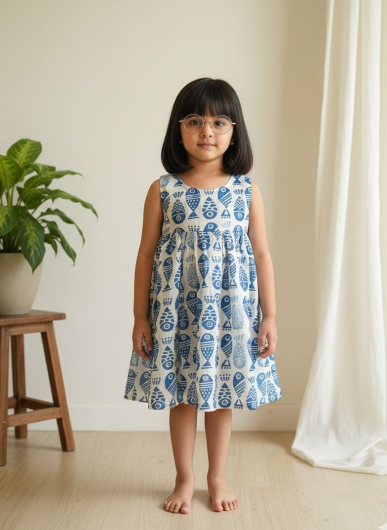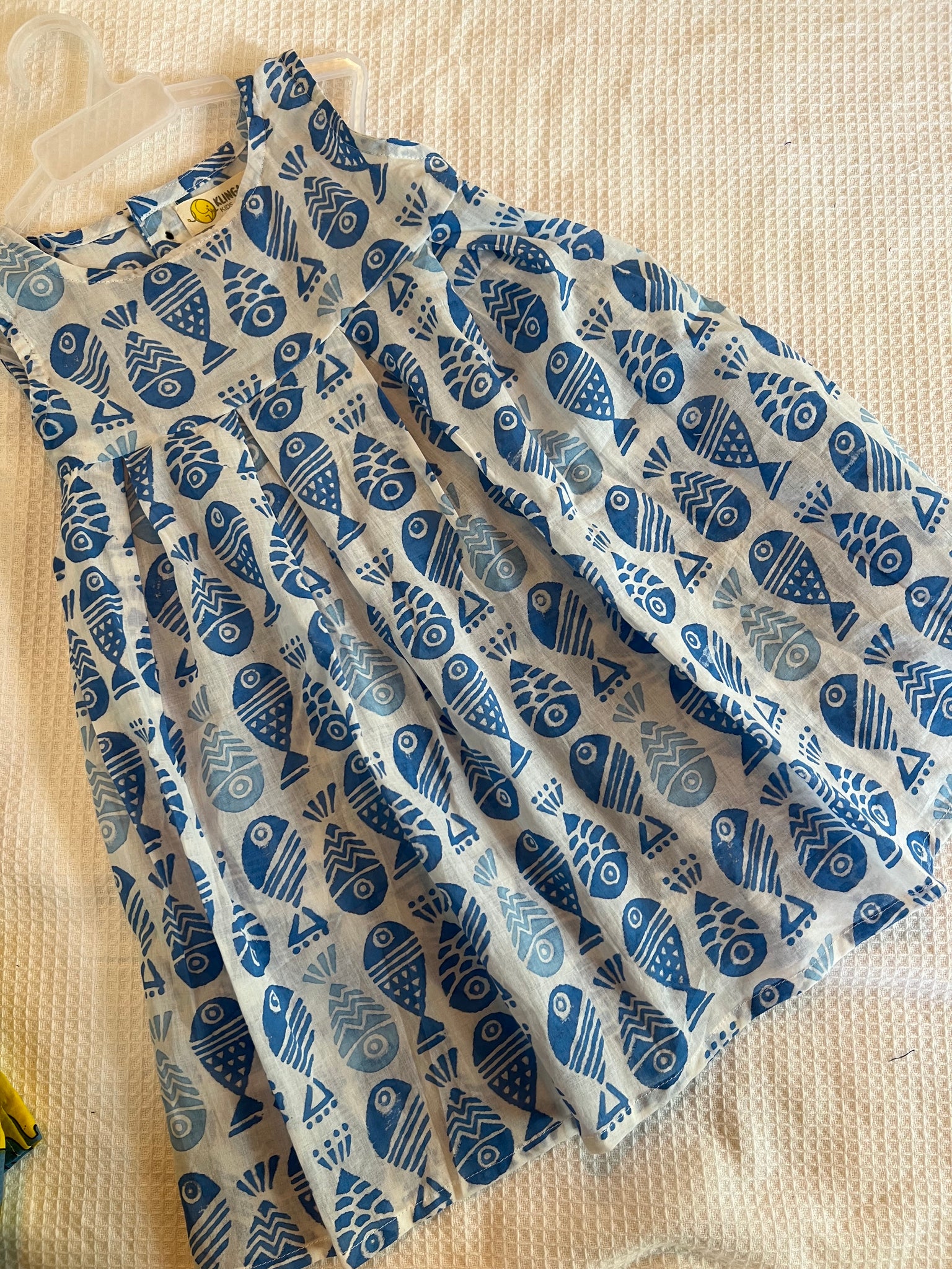 Introducing the Klingaru Frock - Blue White Fish. This summer frock is perfect for playwear and casual wear. With its comfortable fabric and cute prints, your little one will be stylish and happy all day. (Guaranteed to make your little one the cutest fish in the sea!)