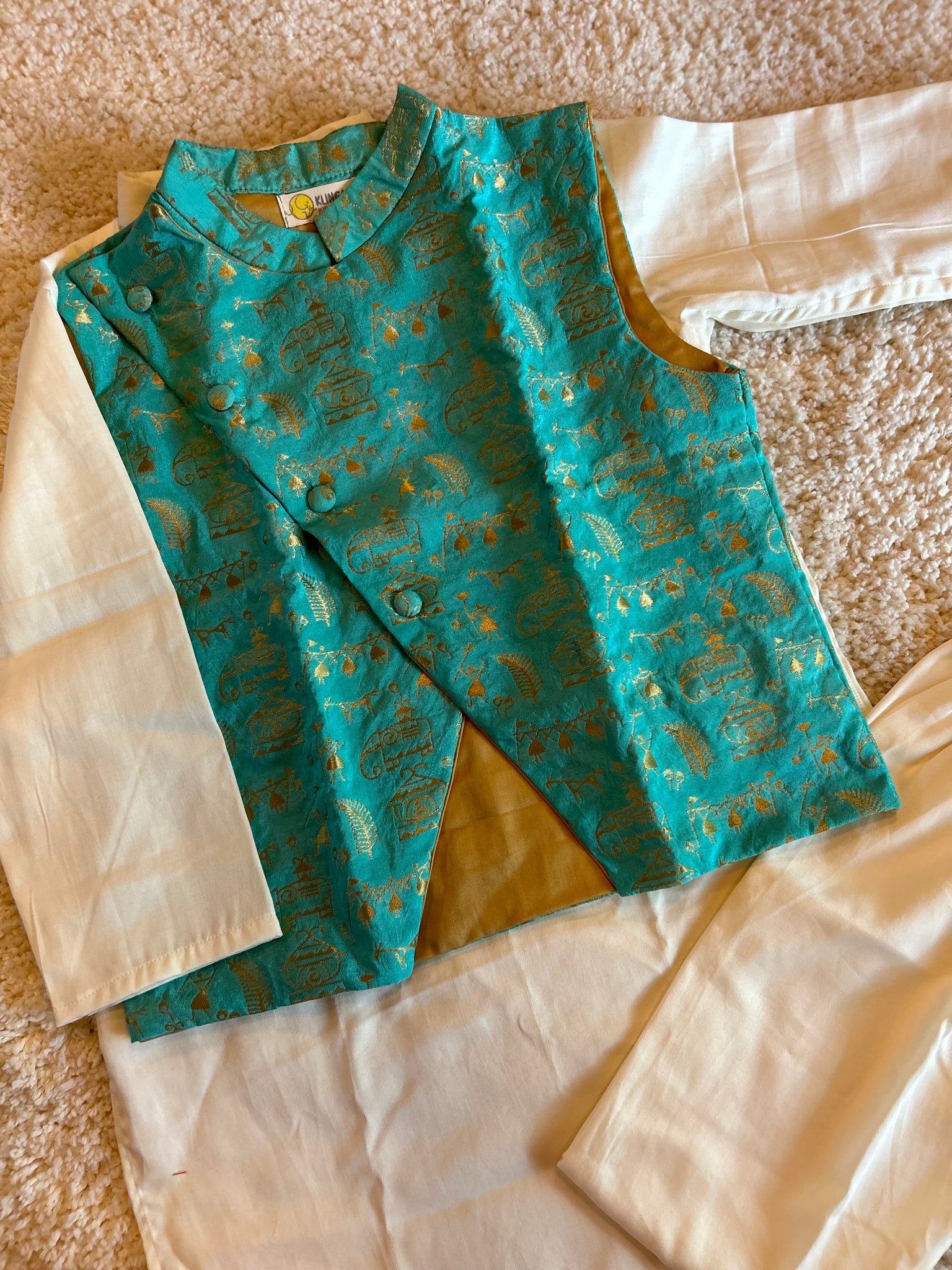 Elevate your festive style with our Offwhite Kurta Pajama set, topped with a show-stopping Teal Warli Jacket. The glaze cotton fabric adds a subtle sheen while the traditional Warli art brings playful charm to your celebrations. Turn heads at every gathering with this perfect blend of comfort and cultural flair!